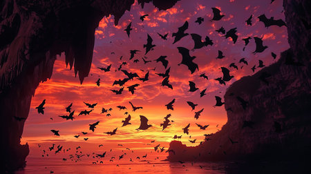 Majestic flight of bats from a cave at dusk, sky painted in shades of orange and pink
