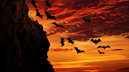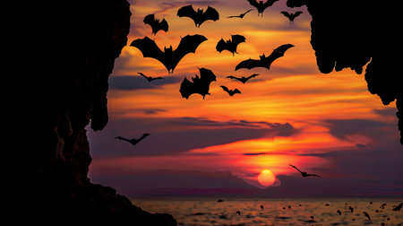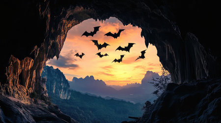 Bat with outstretched wings flying from a dark cave entrance. bright sunrise illuminates the horizon, creating a dramatic silhouette against the sky.