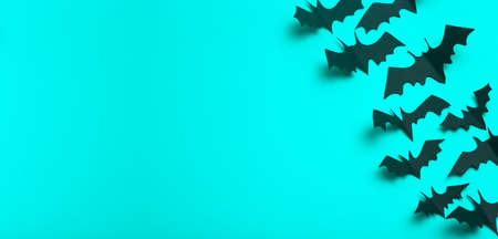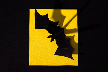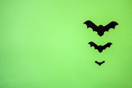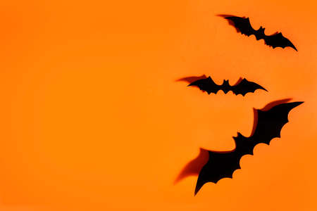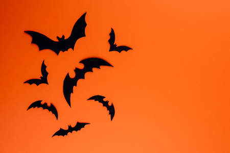 Halloween holiday concept. Black paper bats on bright orange background, top view, flat lay, copy spaes. Celebration of the dead.