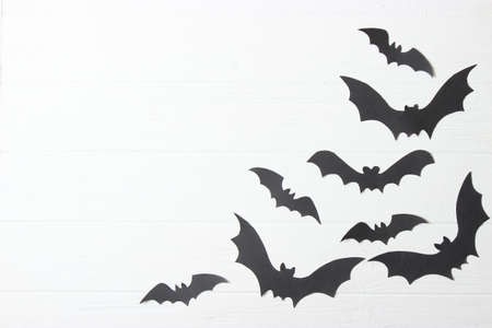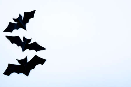 Halloween white background with black bats. View from above. Holiday decorations concept. Copy space, top view, flat lay. DIY