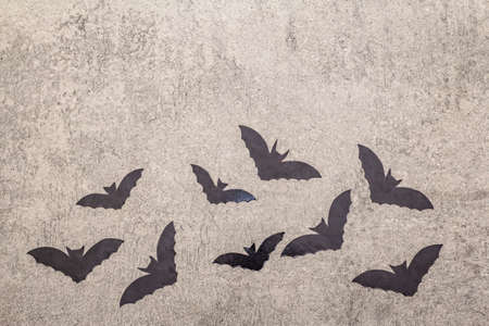 Halloween decoration concept - black bats on gray stone concrete background. Wallpaper, backdrop, card, flat lay, place for text, copy space