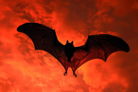 Silhouetted bat flying through cloudy sky at sunset, A black bat silhouetted against a blood-red sky