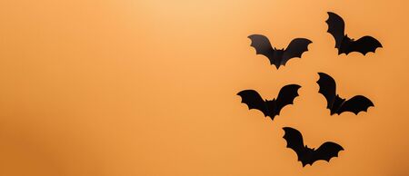 Halloween background, decorations and scary concept. Black bats fly over orange background. top view