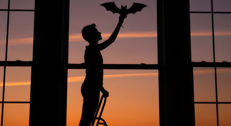 A silhouette of a person stands on a ladder in front of a large paned window, holding a bat decoration up to the glass. The beautiful sunset outside casts a warm orange and purple glow, creating a festive atmosphere for Halloween preparations.