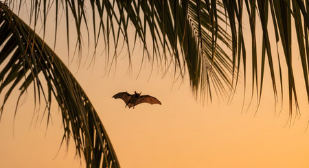 A silhouette of a bat flying against a vibrant golden sunset sky, framed by tropical palm leaves. The scene captures the beauty of wildlife at dusk in a tropical environment.
