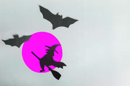 The shadow of a black witch on a broom in the fog and bats on the disk of the red moon gray background is a place for text.