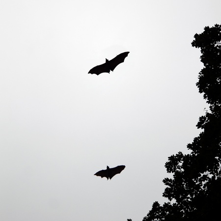 silhouette of two fruit bats hanging upside down in a tree, one wrapped inside its wings, the other with its wings open