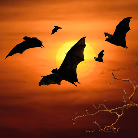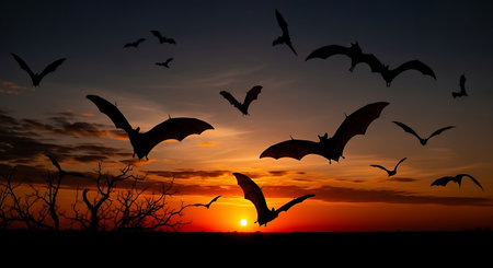 A flock of bats fly in silhouette against a sunset sky, creating a dramatic and mysterious scene.