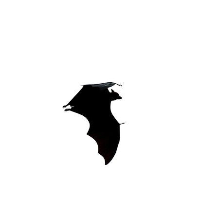 A single bat in mid flight, its wings spread wide, creates a dark silhouette against a cloudy sky. The bat's wings are outstretched, giving it a sense of power and freedom as it navigates the air.