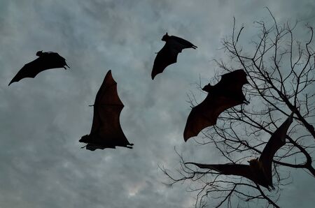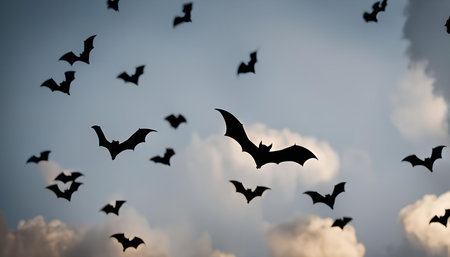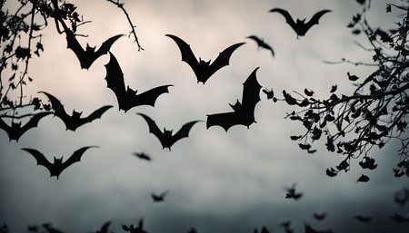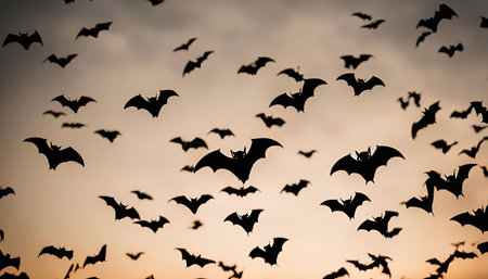A silhouette of numerous bats flying in the twilight sky, creating a dramatic and eerie atmosphere.