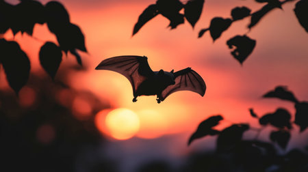 A stunning image of a bat flying at sunset, framed by dark silhouettes of leaves. This captivating scene captures the essence of wildlife and natural beauty in the evening sky.