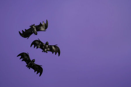 Paper bats on a purple background with golden bokeh. Festive background for Halloween