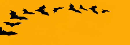 Several black vampire bats in line on orange background. Happy Halloween banner with copy space. Selective focus. Minimal