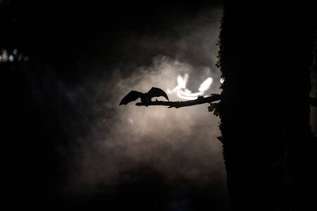 Bat on a background of tree silhouettes. Image with place for text on Halloween.