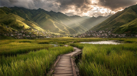 A captivating view of a remote village nestled among mountains, with a digital connection overlay symbolizing the intersection of technology and rural life in a serene landscape.