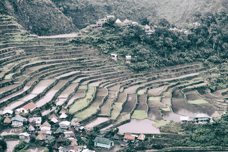 Village houses near rice terraces fields. Amazing abstract texture with sky colorful reflection in water. Ifugao province. Banaue Philippines UNESCO heritage