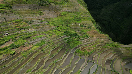 Steep terraces of rice plantations in Philippines. Agricultural landscape surrounded by lush tropical vegetation.