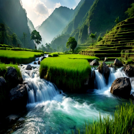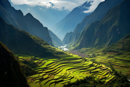 A stunning view of terraced rice fields showing vibrant green patches of farmland nestled among majestic mountains, symbolizing rural beauty and agriculture.