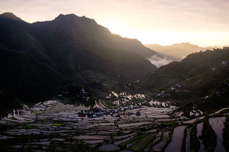 Sunset in the rice field terraces in the area of batad, in Philippines