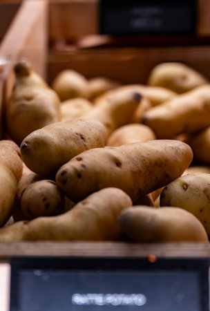 New potatoes on the store counter, vegetable theme, Fresh organic potatoes.