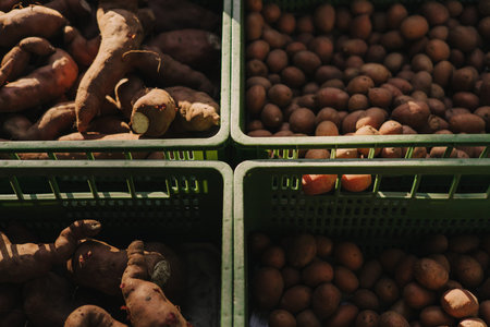 Sweet potato at small local urban market. Organic produce on sale at outdoor farmer market. Selling fresh crops and veggies harvest. European urban setting. Close up. Part of the series