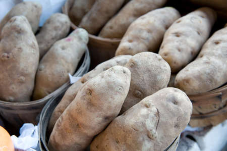 Fresh batata at small local urban market. Organic produce on sale at outdoor farmer market. Selling fresh crops and veggies harvest. Urban setting. Close up. Part of the series.