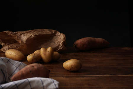 Various sweet potato on wooden background, Imperfectly shape, Food trend