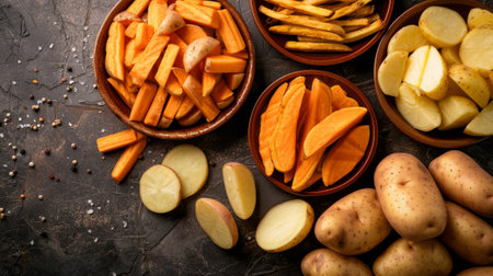 A table with a variety of vegetables including potatoes, carrots, and sweet potatoes. The table is covered with different bowls and bags containing the vegetables. Concept of abundance and variety