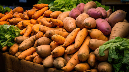 A variety of vegetables including carrots, potatoes, and sweet potatoes are displayed on a table. Concept of abundance and variety