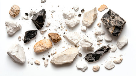 A diverse assortment of rocks and minerals displayed on a clean white background, showcasing textures and natural forms for artistic and educational applications.