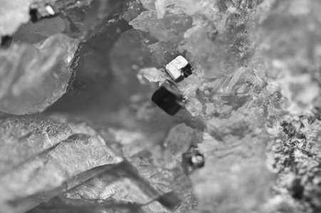 Crystals Rhodochrosite with particles of Pyrite. Black-and white texture of mineral for background. Macro.