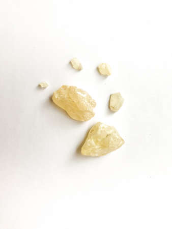 natural incense, dammar resin close-up on a white background. Soft focus, place for text and and top view