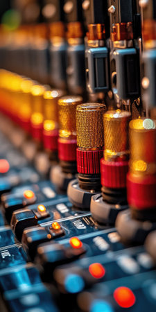 An audio mixer with its knobs and sliders meticulously adjusted, embodying precision and control in the art of sound engineering and music production