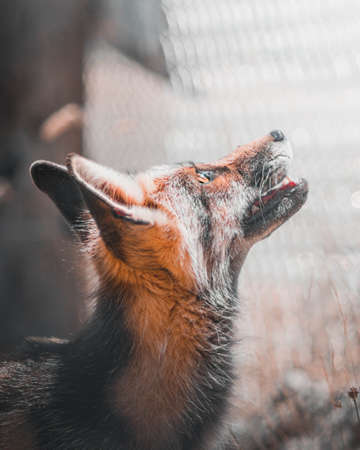 portrait of a sad fox in a cage at the zoo.