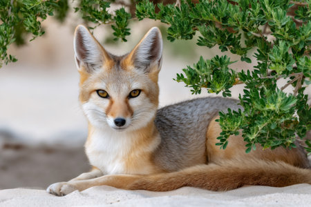 Kit fox resting on sandy ground, looking directly at camera under green shrub