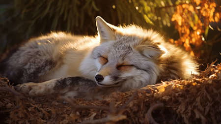 A sleepy red fox curled up in a cozy den, its bushy tail wrapped around its body as it naps peacefully.