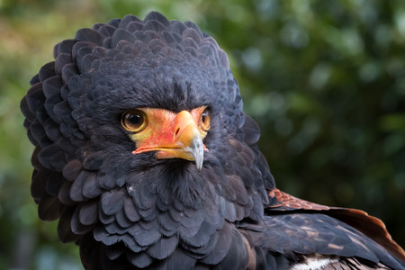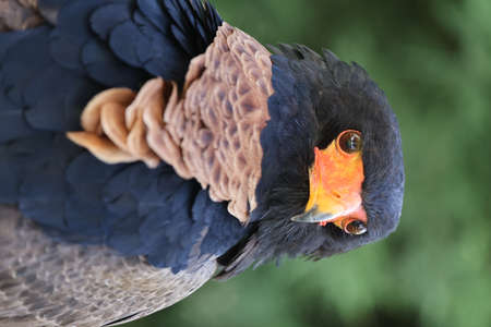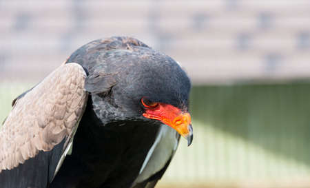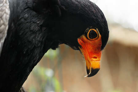 close up portrait of bateleur, Terathopius ecaudatus, bird with orange beak