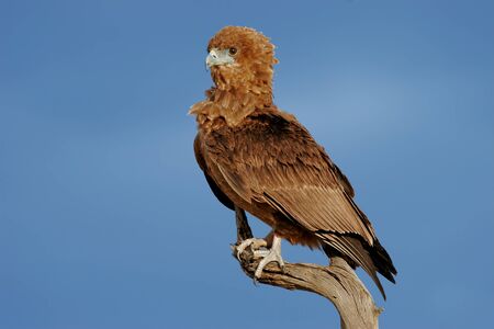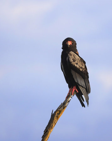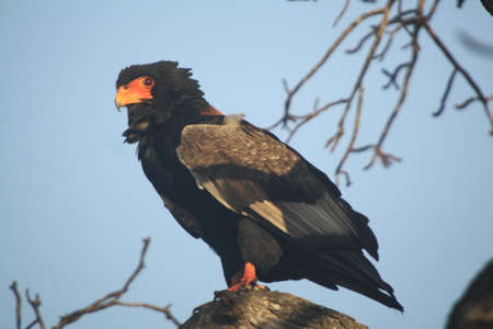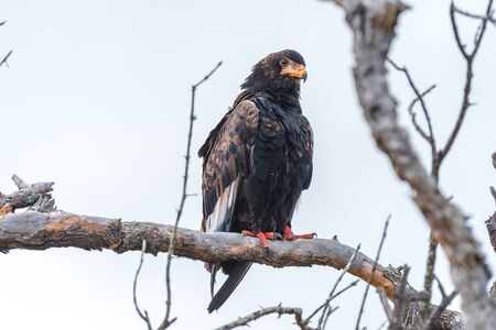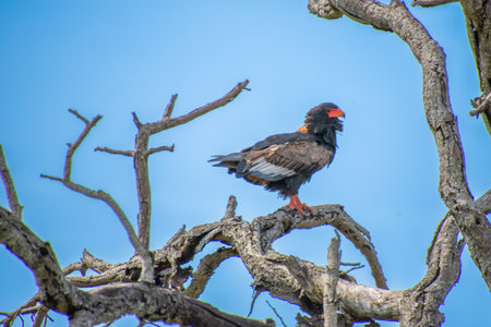 Bateleur eagle (Teratophius Ecaudatus) sitting on a dry branch of a tree against blue sky in South Africa