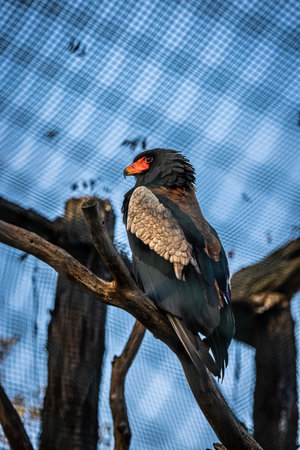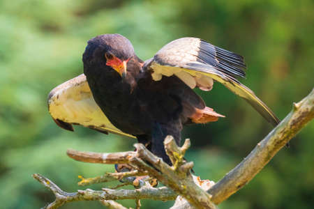 Closeup of a bateleur Terathopius ecaudatus eagle, bird of prey, perched on a branch with open wings. National emblem of Zimbabwe