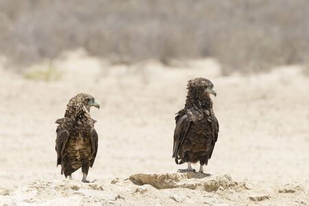 Two Juvenile Bateleur Eagles, (Terathopius ecaudatus) Kgalagadi Transfrontier Park, Northern Cape, Kalahari, South Africa perched on rocks