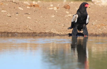 Pair of bateleur standing at a waterhole busy with mating