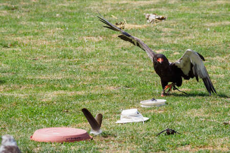 bateleur eagle, Terathopius ecaudatus, sitting on the road and feeding on a dead snake.