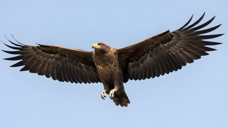 A majestic brown eagle flies with wings fully spread against a clear blue sky. The bird's intense gaze and detailed feathers highlight its power as a bird of prey.