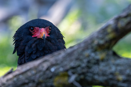 Bateleur (Terathopius ecaudatus) looking directly at camera from behind a tree branch