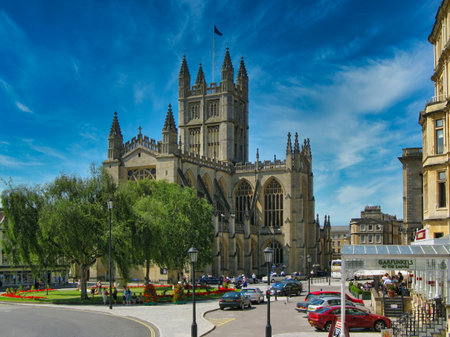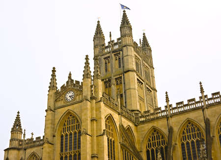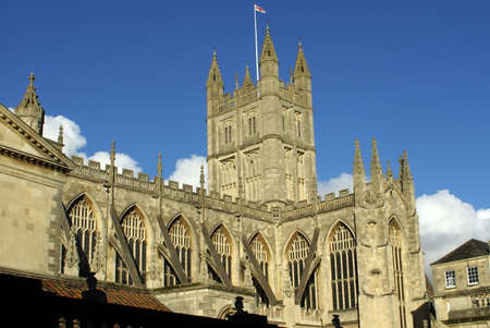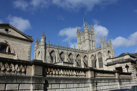 An exterior view of the stunning old stone Cathedral building in the town of Bath in England.