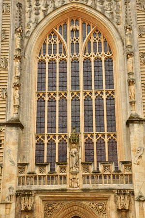 West front facade of Bath Abbey. Large stain glass window set in ornately carved stone surround. 16th Century church, Bath, England, United Kingdom