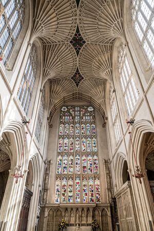 Stained glass window at the ended of a nave with a vaulted ceiling at the Bath Abbey in Bath, England, UK