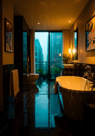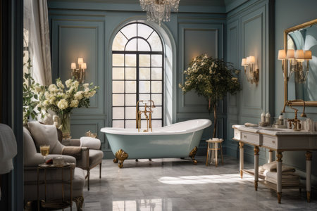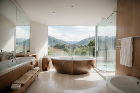 Modern bathroom with big windows and an oval tub. Generative AI illustration