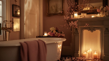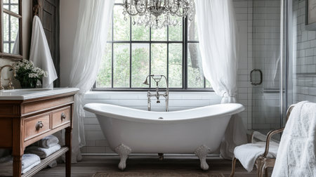 Discover an elegant bathroom featuring a vintage clawfoot tub, a stunning chandelier, and a cozy atmosphere, perfect for relaxation and rejuvenation.