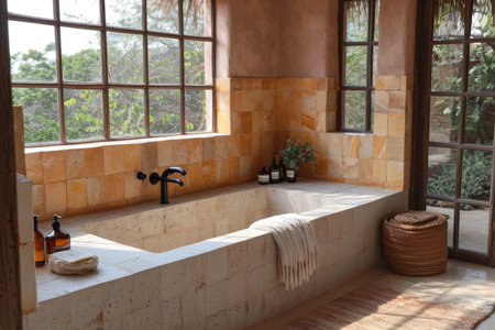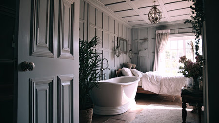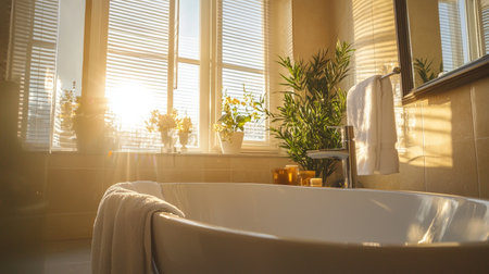 A bathroom with a bathtub and a plant in it. AI generative image.